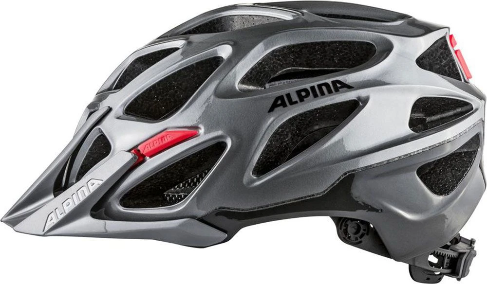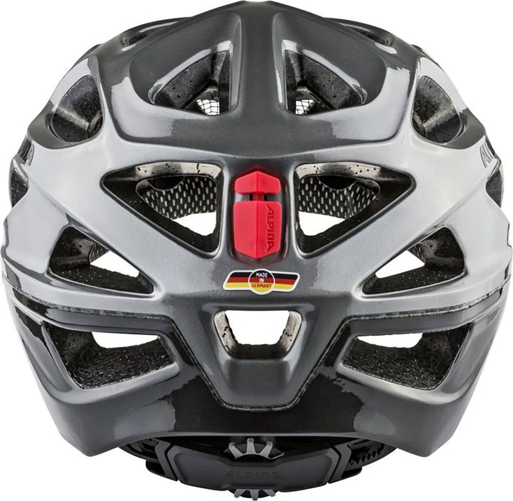 Probado cientos de miles de veces y utilizado en todos los cascos de bicicleta Alpina: la conocida hebilla de cinturón con pulsador rojo y retención automática de varios niveles. Ergomatic se puede manejar con una sola mano – se puede aflojar la correa cuesta arriba, apretarla cuesta abajo – y no se puede abrir en caso de caída.